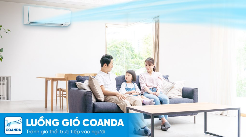 - Luồng gió thoải mái Coanda thổi gió hướng lên trên, đi dọc theo trần, đến các góc rồi từ từ thả xuống bên dưới giúp cho không gian phòng trở nên dễ chịu, thư thái, bạn không còn lo lắng vấn đề ảnh hưởng sức khỏe khi gió thổi trực tiếp vào người.