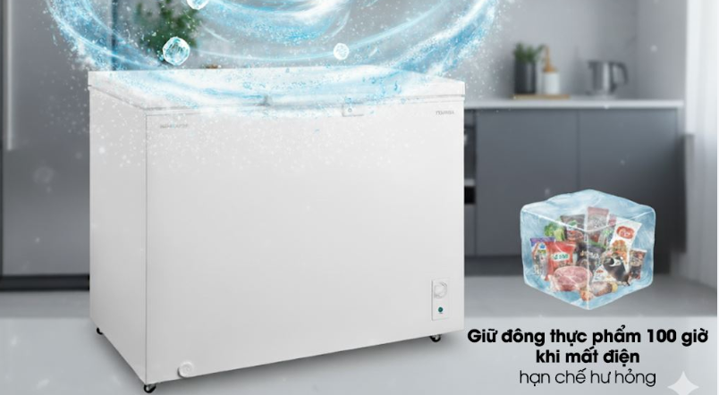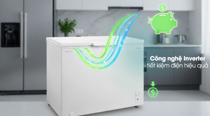 Trang bị công nghệ Inverter hiện đại, tủ đông Toshiba vận hành ổn định và êm ái, đồng thời giảm đáng kể điện năng tiêu thụ, chỉ khoảng 402 kWh/năm. So với các mẫu tủ đông thông thường, công nghệ này giúp tiết kiệm chi phí hàng tháng mà vẫn đảm bảo hiệu quả làm lạnh.